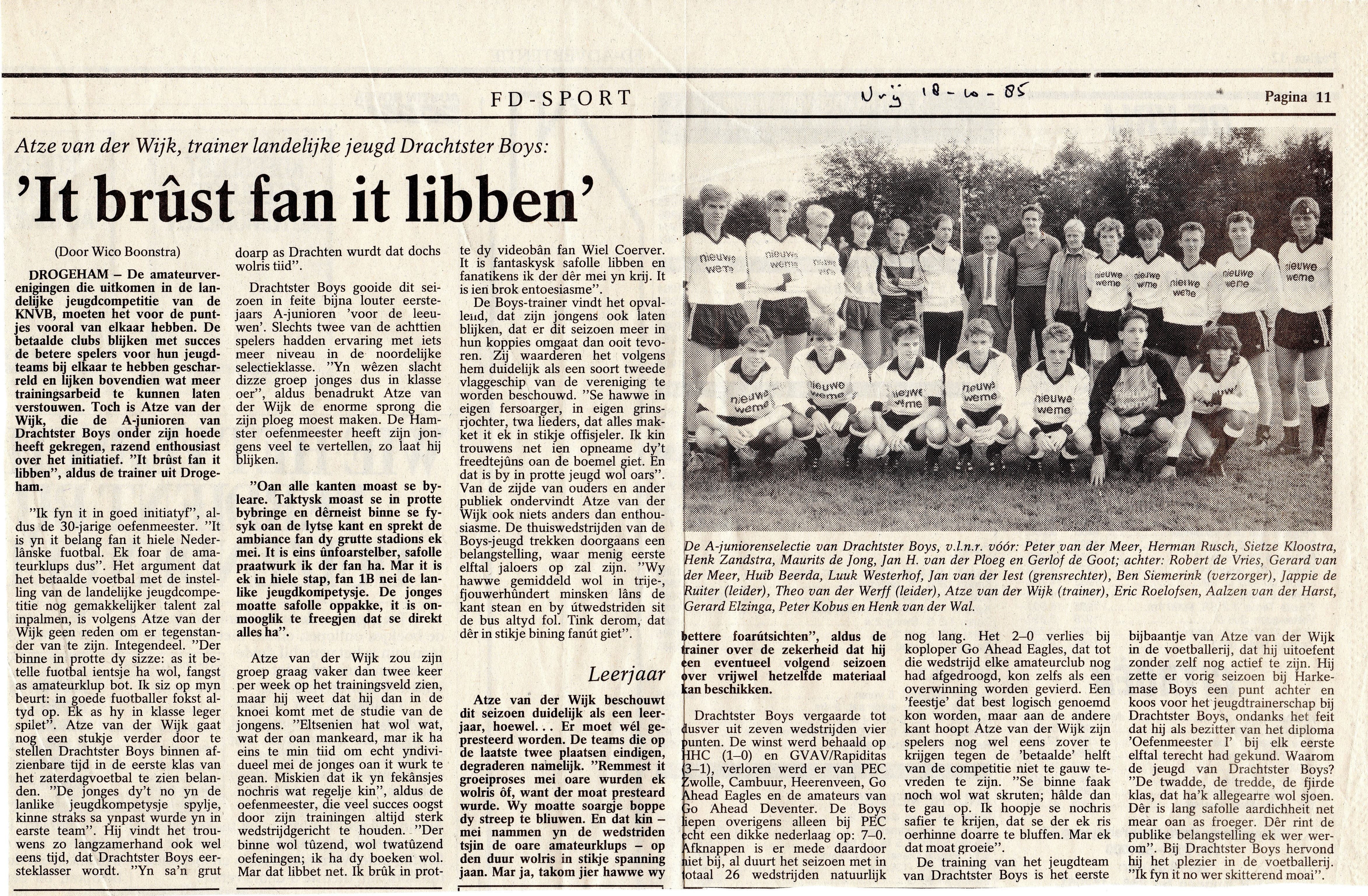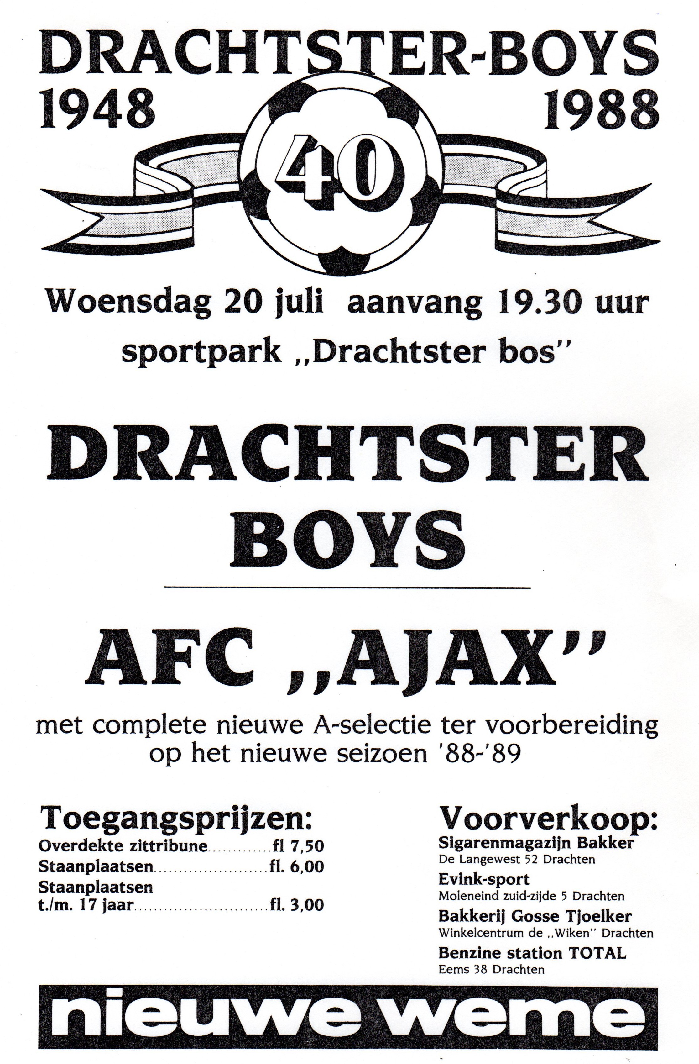 Op 20 juli 1988 vindt een unieke wedstrijd plaats op het sportcomplex van Drachtster Boys. Het team van toenmalig trainer Erik Assink oefent tegen landskampioen AFC Ajax, dat ter voorbereiding op de voetbalcompetitie 1988-’89 ook Drachten aandoet. Op de teamfoto o.a. Wim Jonk, Robby Witsche en Jantje Wouters. Bij Drachtster Boys o.a. Gert Jan Miedema, Oedo Mulder en de broertjes Gerard en Auke van der Meer.