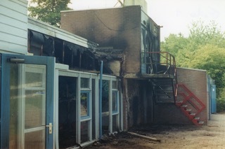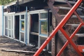 Een zwarte dag in het bestaan van Drachtster Boys. De kantine brandt af. De ravage is enorm. Gelukkig worden de kleedboxen gespaard.