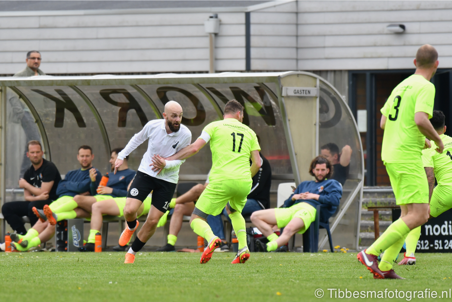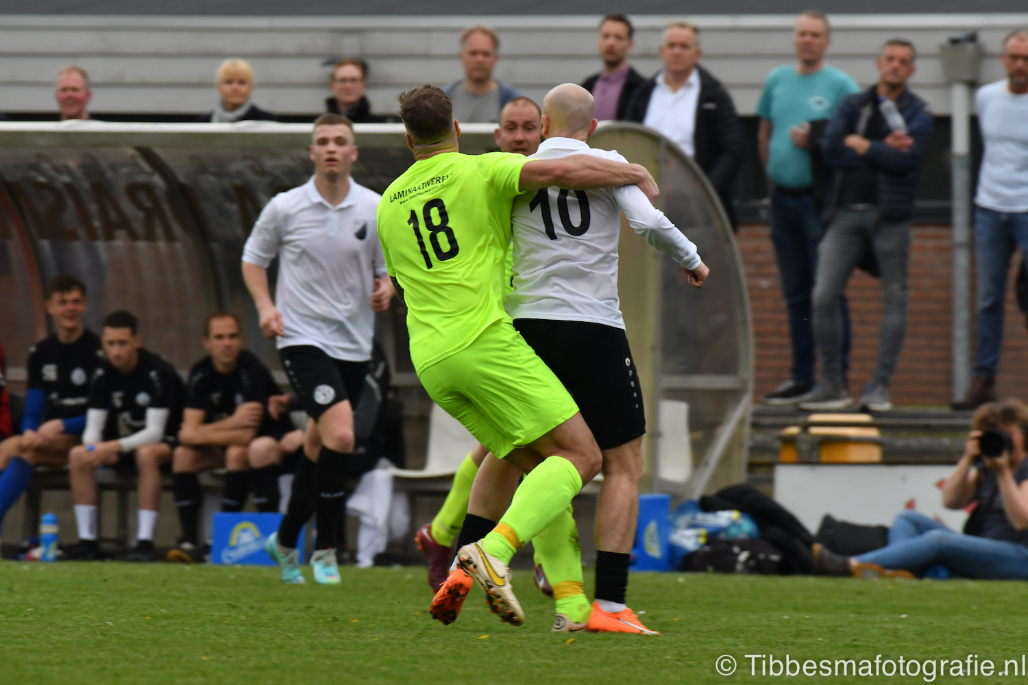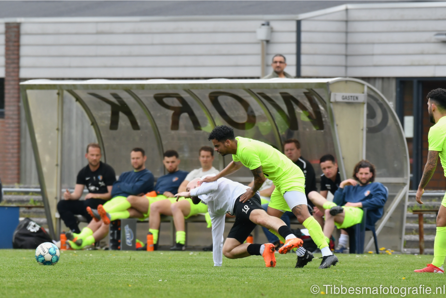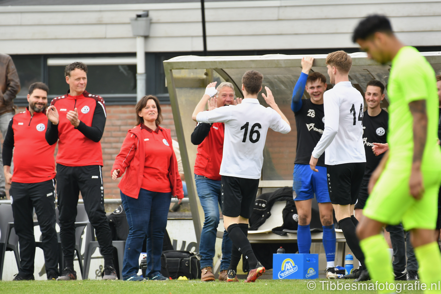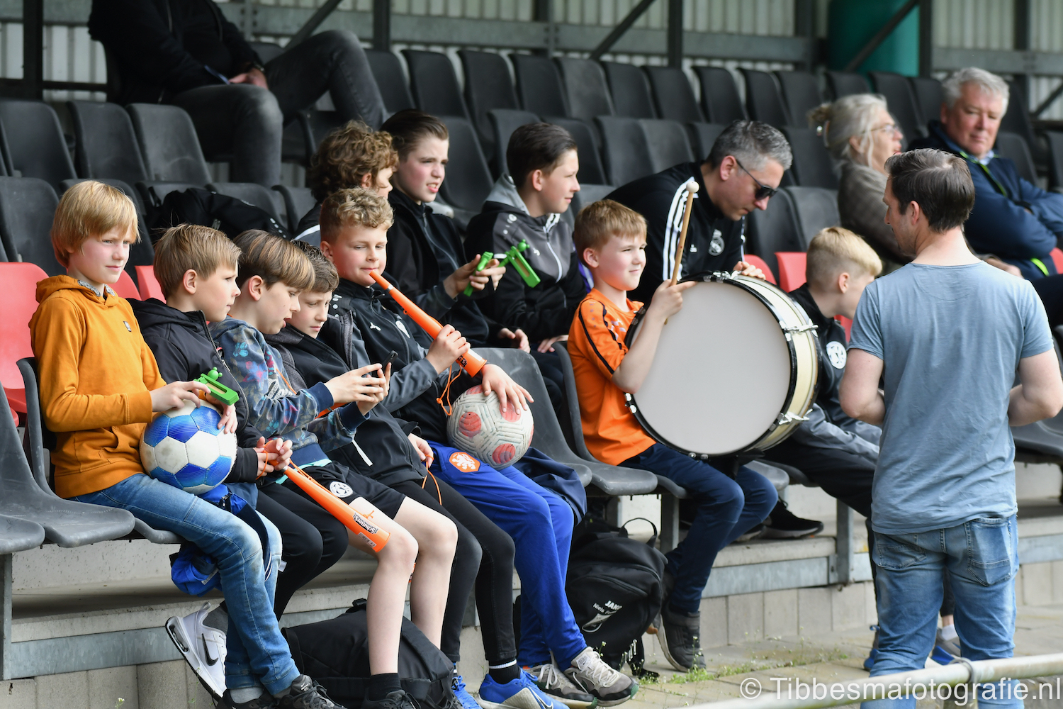 De jeugd die op de sfeeractie af is gekomen ratelt, toetert en trommelen er lustig op los tot dat moment. Ze maken de tribune een stukje feestelijker. Het weer is prachtig. Het zonnetje heeft genoeg kracht om door