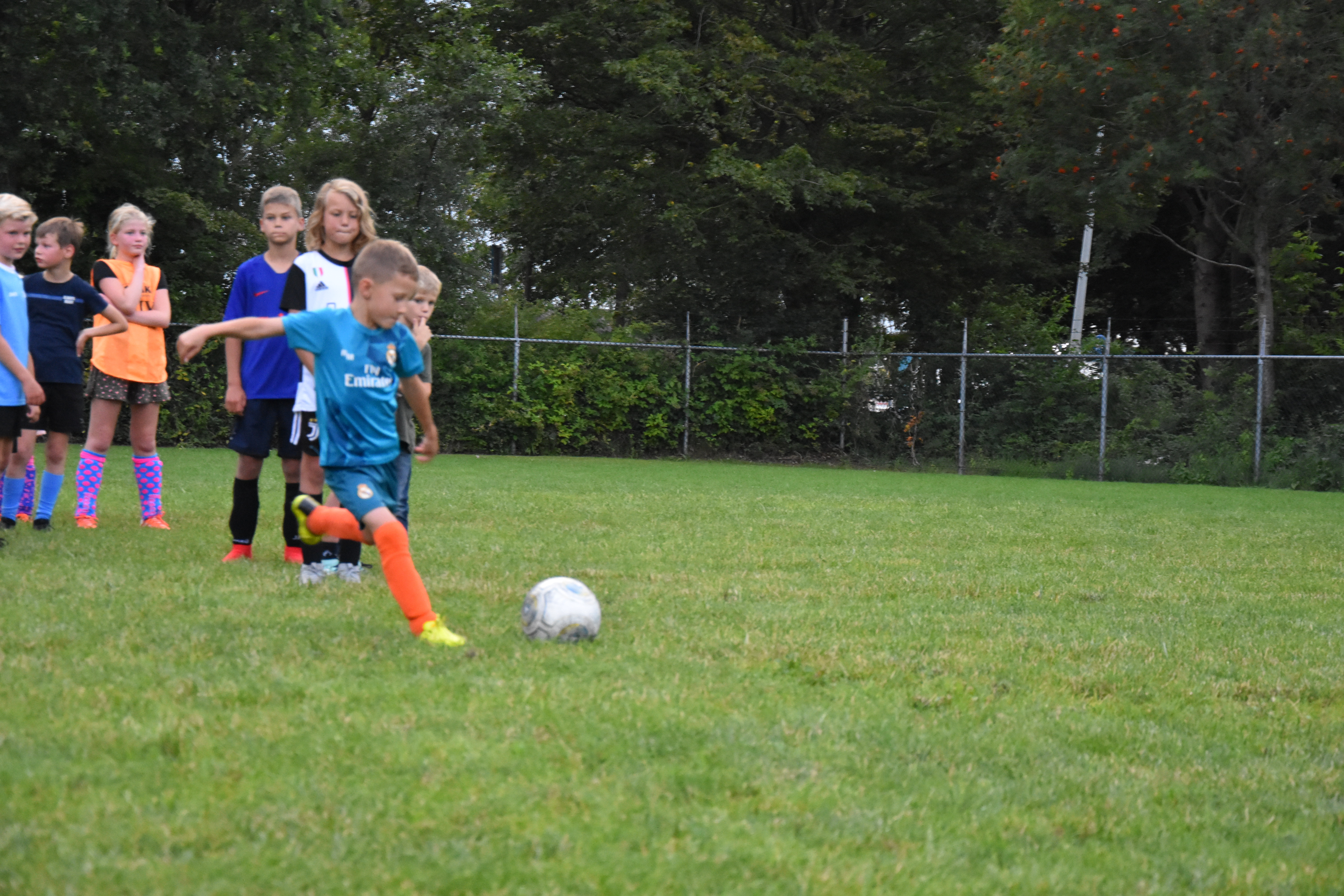 Ik ben blij dat er ouders zijn op het veld. Maandenlang mochten ze er niet bij zijn, in verband met de coronamaatregelen. Ze houden gepaste afstand, en leven mee. Sommige kinderen zijn met de auto afgezet in het Drachtster Bos, en dat is óók goed: wij passen goed op ze. Ik zie Michiel, Peter en Jort hun uiterste best doen om de kinderen zoveel mogelijk voetbalplezier te laten hebben. Het betekent trouwens dat ik eindelijk toekom aan wat ik al een hele week wil doen: foto’s maken.