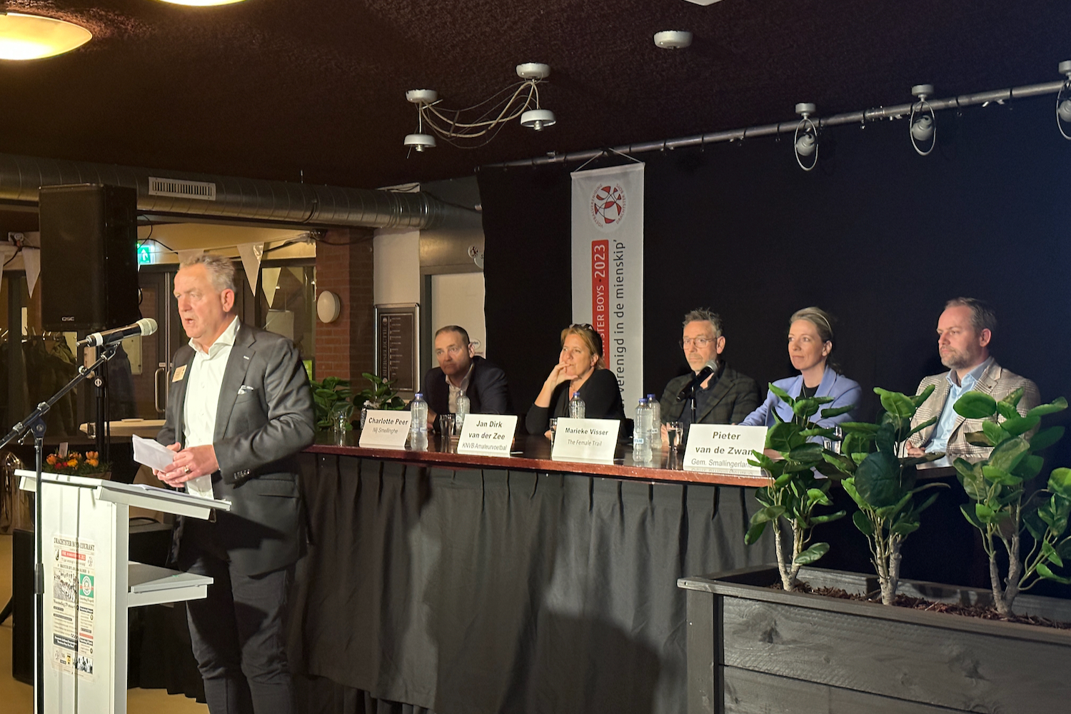 Onder ontspannen begeleiding van Omrop Fryslân-journalist Geert van Tuienen kregen vijf sprekers het woord. Directeur amateurvoetbal KNVB Jan Dirk van der Zee vertelde over hoe groots en veelomvattend het amateurvoetbal in Nederland eigenlijk is, wethouder van onder meer sportzaken Pieter van der Zwan ging dieper in op het belang van Drachtster Boys voor de gemeente Smallingerland en overhandigde nog een verjaardagscheque aan voorzitter Gijs Lokhorst. Daarna was het woord aan Marieke Visser, kind van de club en oprichter van The female trail. Zij daagde het publiek uit mee te denken over hoe inclusief voetbal eigenlijk is. Na een muzikaal intermezzo van Femke van Asselt was het woord aan kinderarts Charlotte Peer van Nij Smellinghe, over het belang van beweging bij kinderen. Het laatste woord was aan Biense Dijkstra van Bouwgroep Dijkstra Draisma, over hoe BGDD investeerd in regionale sport en cultuur. Ook hij overhandigde een cadeau: een verlenging van het sponsorcontract tot en met 2028. Het cadeau kwam overigens niet geheel onverwacht, getuige de respons van voorzitter Gijs Lokhorst, die een speciaal shirt overhandigde. Al met al een hele plezierige en inhoudelijke avond.