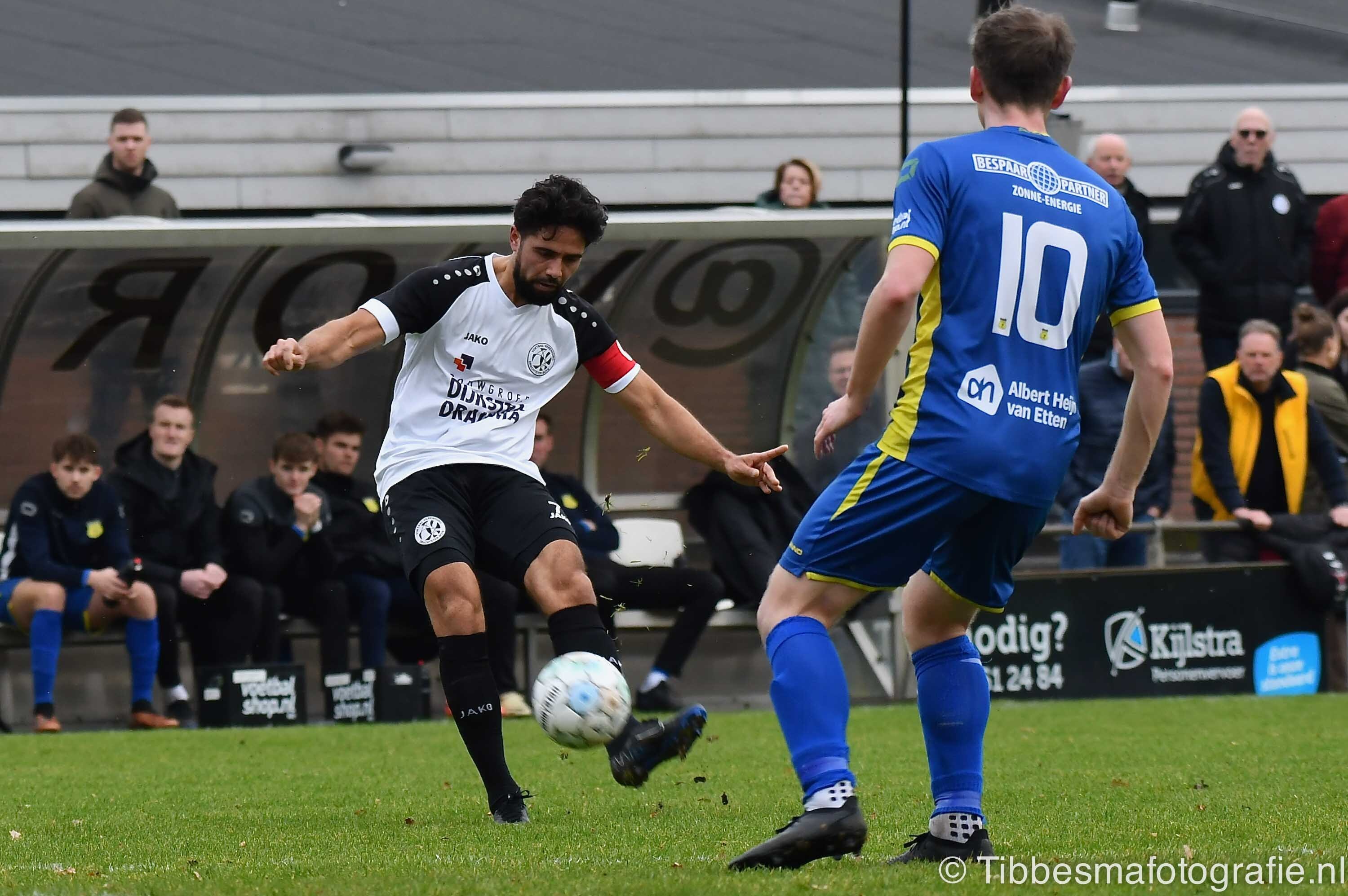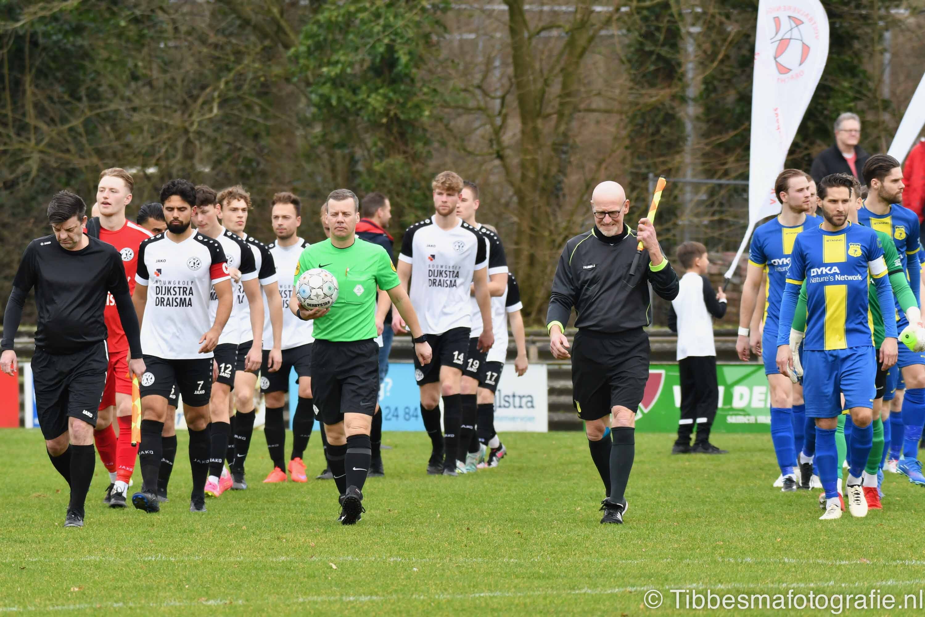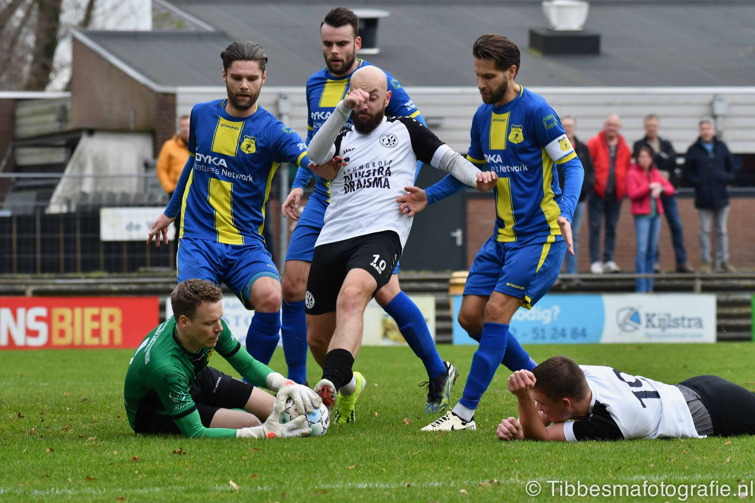 De eerste minuten zijn nog wat stroef. Er wordt gevaarlijk met het hoofd uitverdedigd. De kopbal van Erik schampt de paal van keeper Emile. Daarna gaat het echt los. Hartverwarmende lef en aanvalsdrift van de mannen uit Drachten. In de 22ste minuut de voorsprong. Joel schiet met militaire precisie vanaf circa twintig meter de bal in de bovenhoek. D’Olde Veste moet daarna alle zeilen bijzetten om nog meer schade te voorkomen.