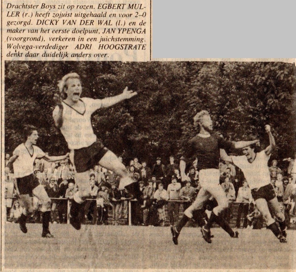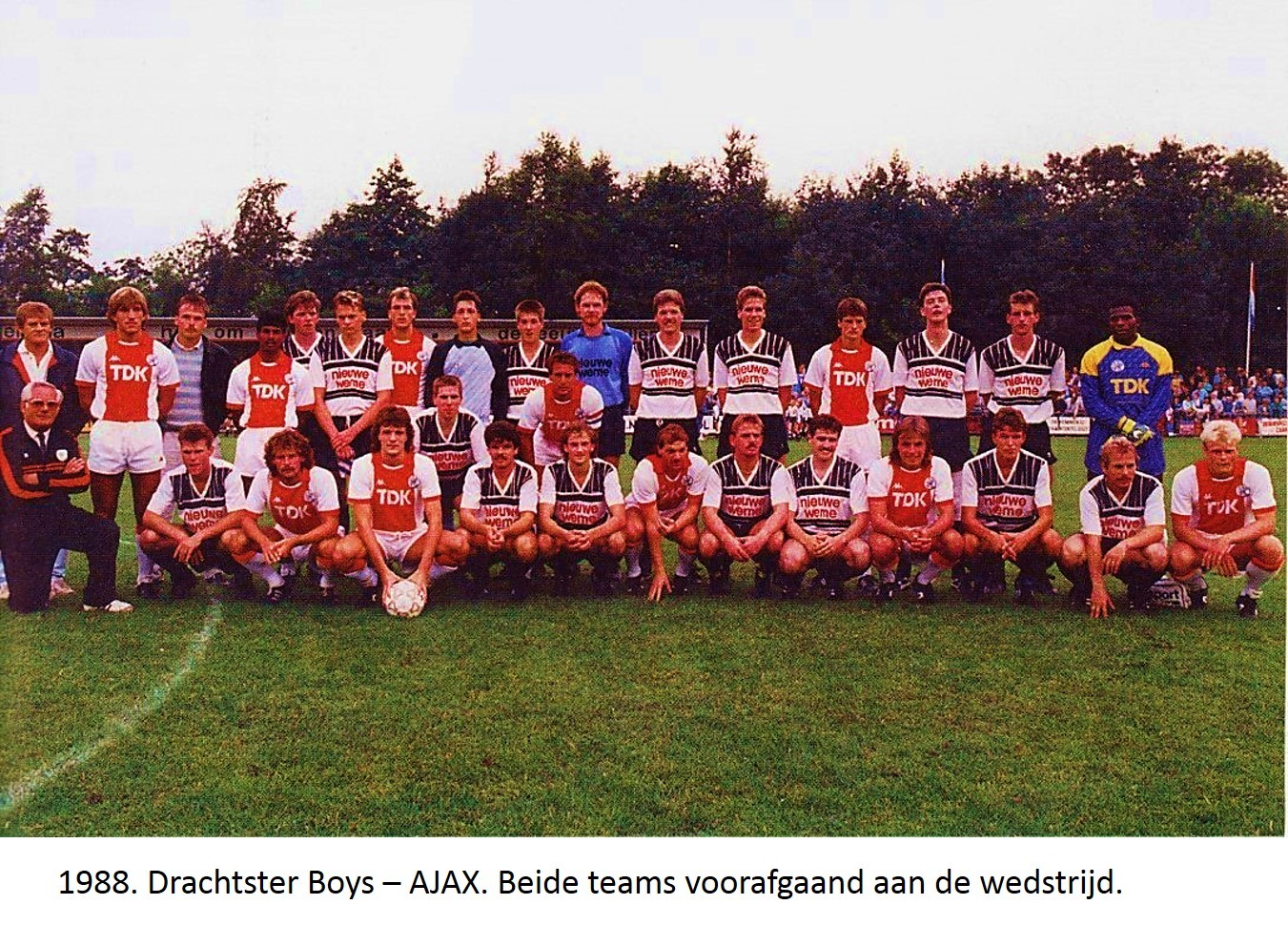 Op 20 juli 1988 vindt een unieke wedstrijd plaats op het sportcomplex van Drachtster Boys. Het team van toenmalig trainer Erik Assink oefent tegen landskampioen AFC Ajax, dat ter voorbereiding op de voetbalcompetitie 1988-’89 ook Drachten aandoet. Op de teamfoto o.a. Wim Jonk, Robby Witsche en Jantje Wouters. Bij Drachtster Boys o.a. Gert Jan Miedema, Oedo Mulder en de broertjes Gerard en Auke van der Meer.