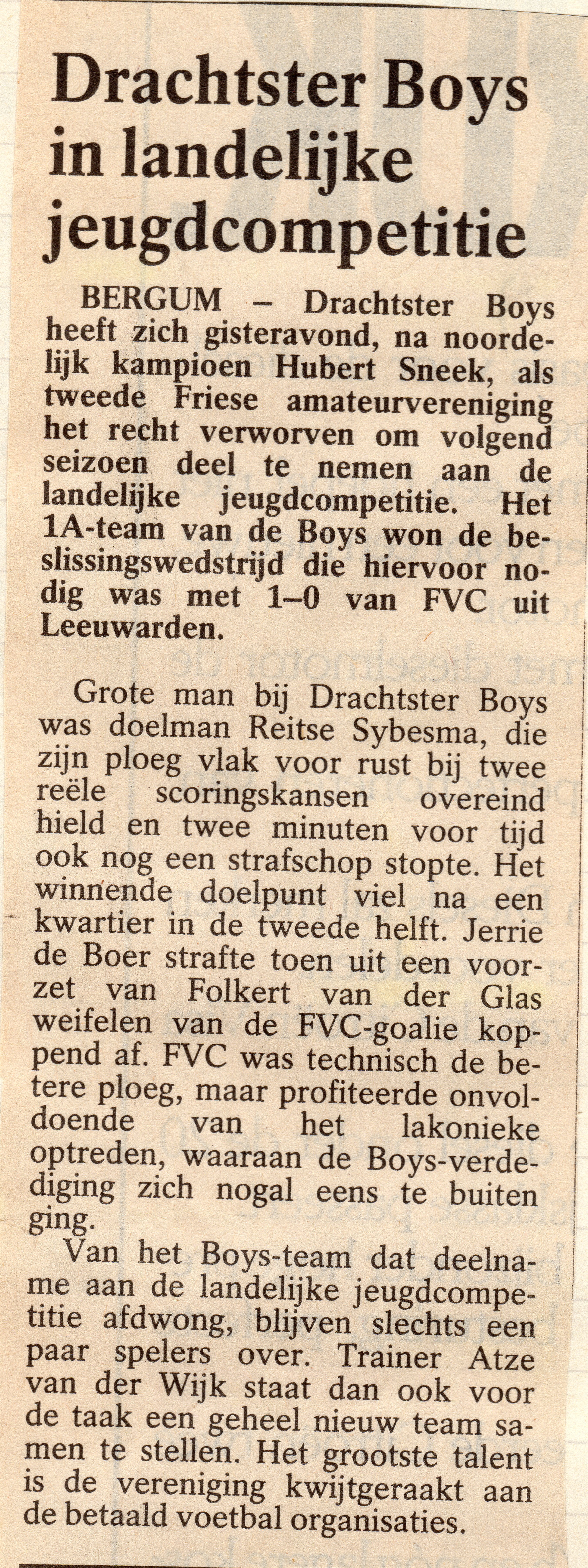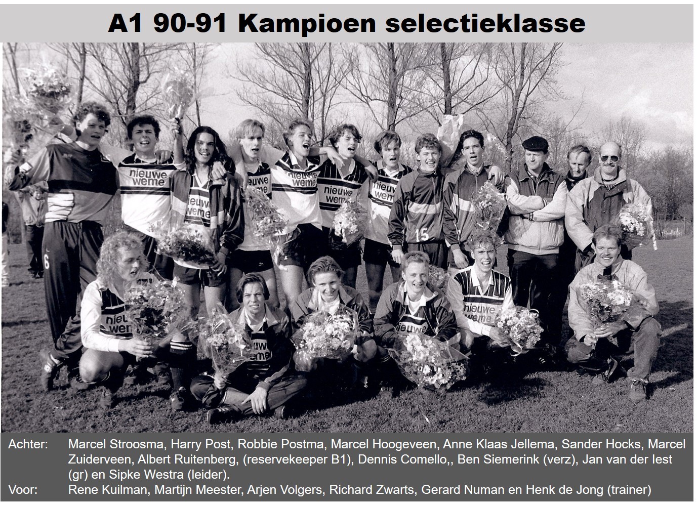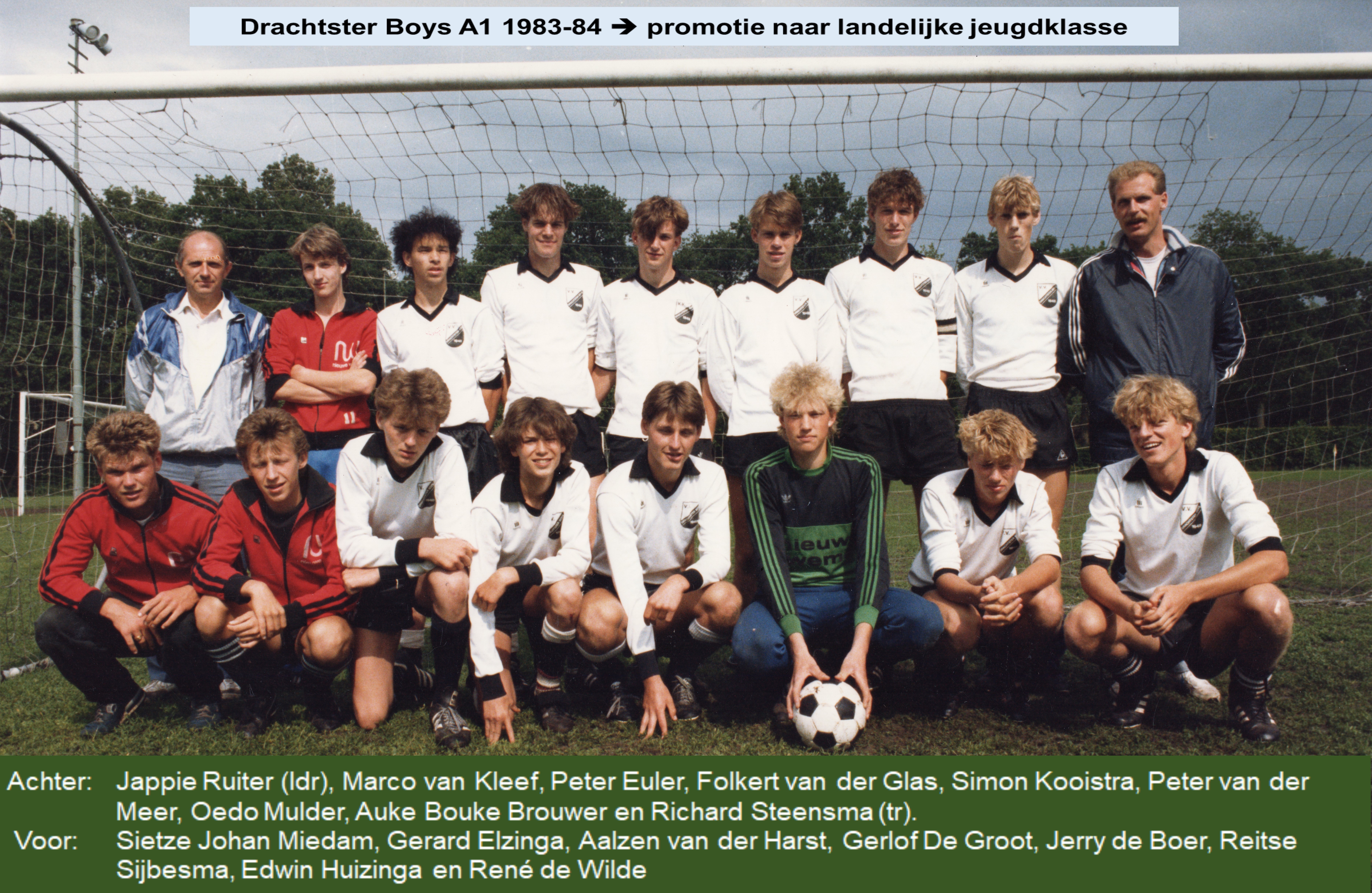 Ook tijdens het voetbalseizoen 1990-’91 presteert de jeugd van Drachtster Boys weer sterk. Op de foto het kampioensteam van A1 na het behalen van het kampioenschap in de selectieklasse. Trainer destijds was een nog piepjonge Henk de Jong… Verder op de foto o.a. Marcel Stroosma, Richard Zwarts en leider Sipke Westra.