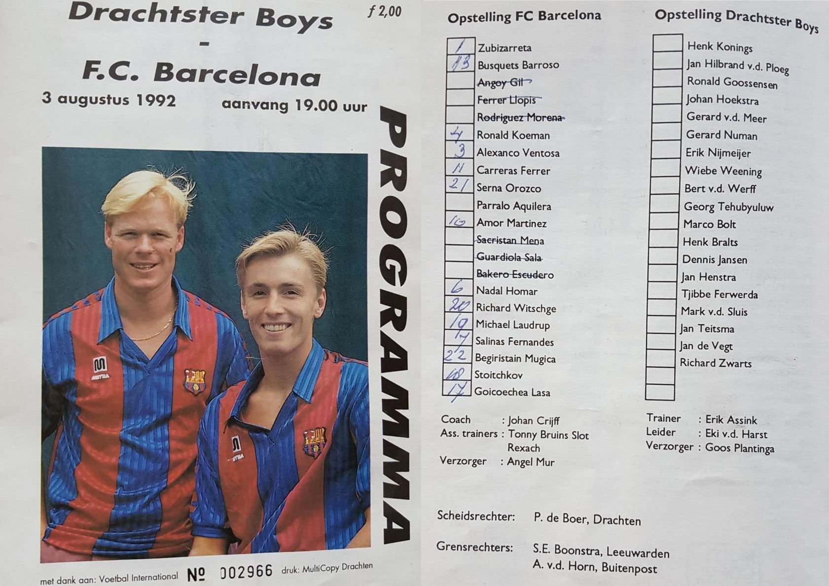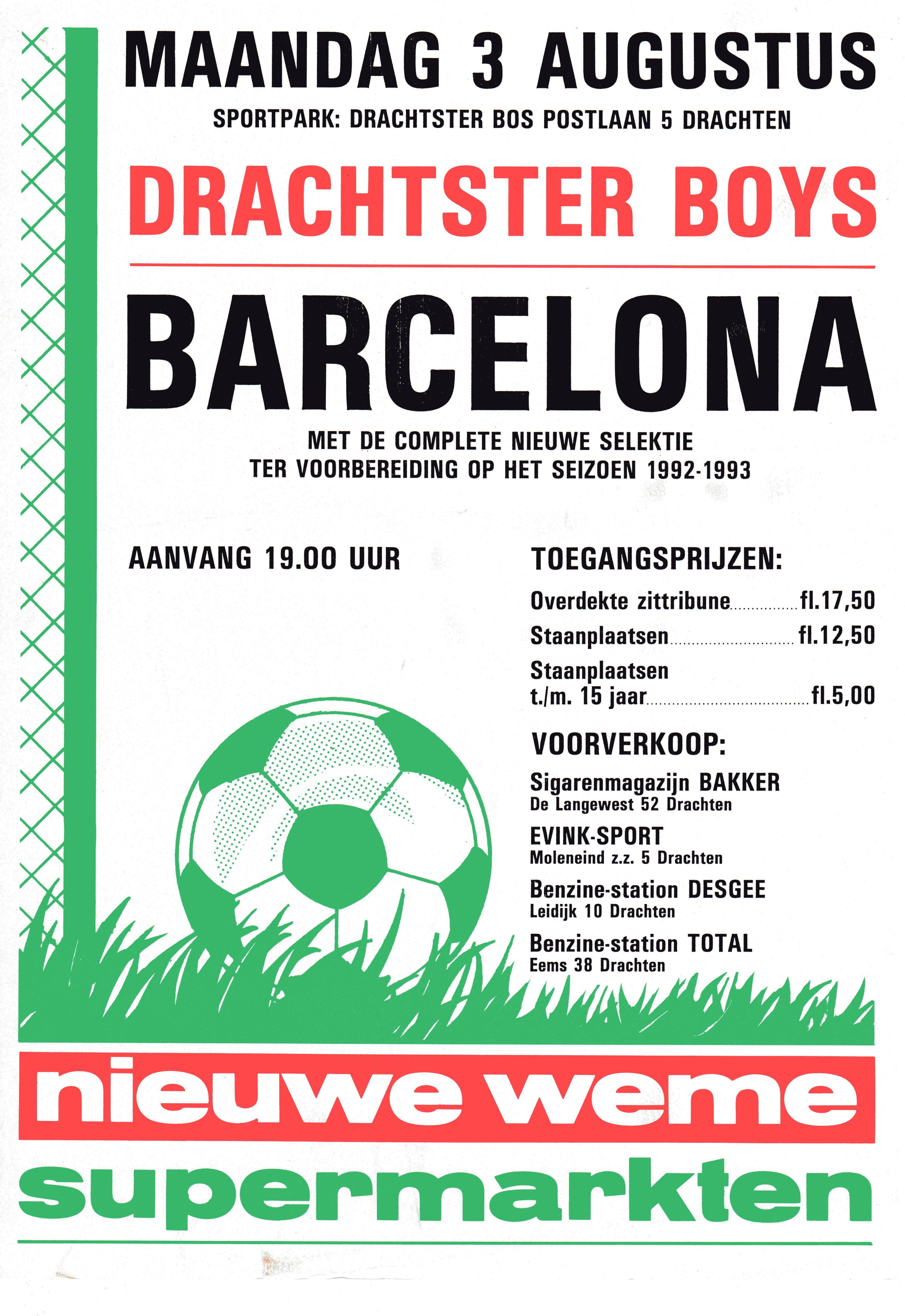 Op 3 augustus 1992 doet de complete nieuwe selectie van FC Barcelona Drachten aan tijdens haar traditionele oefencampagne in Nederland ter voorbereiding van de competitie 1992-’93. Met trainer Johan Cruyff en de Nederlandse vedetten Ronald Koeman en Richard Witsche, en internationale vedetten als de Bulgaar Stoitsjkov en de Deen Michael Laudrup. Bij Drachtster Boys o.a. keeper Henk Konings, Tjibbe Ferwerda en Bert van der Werff.