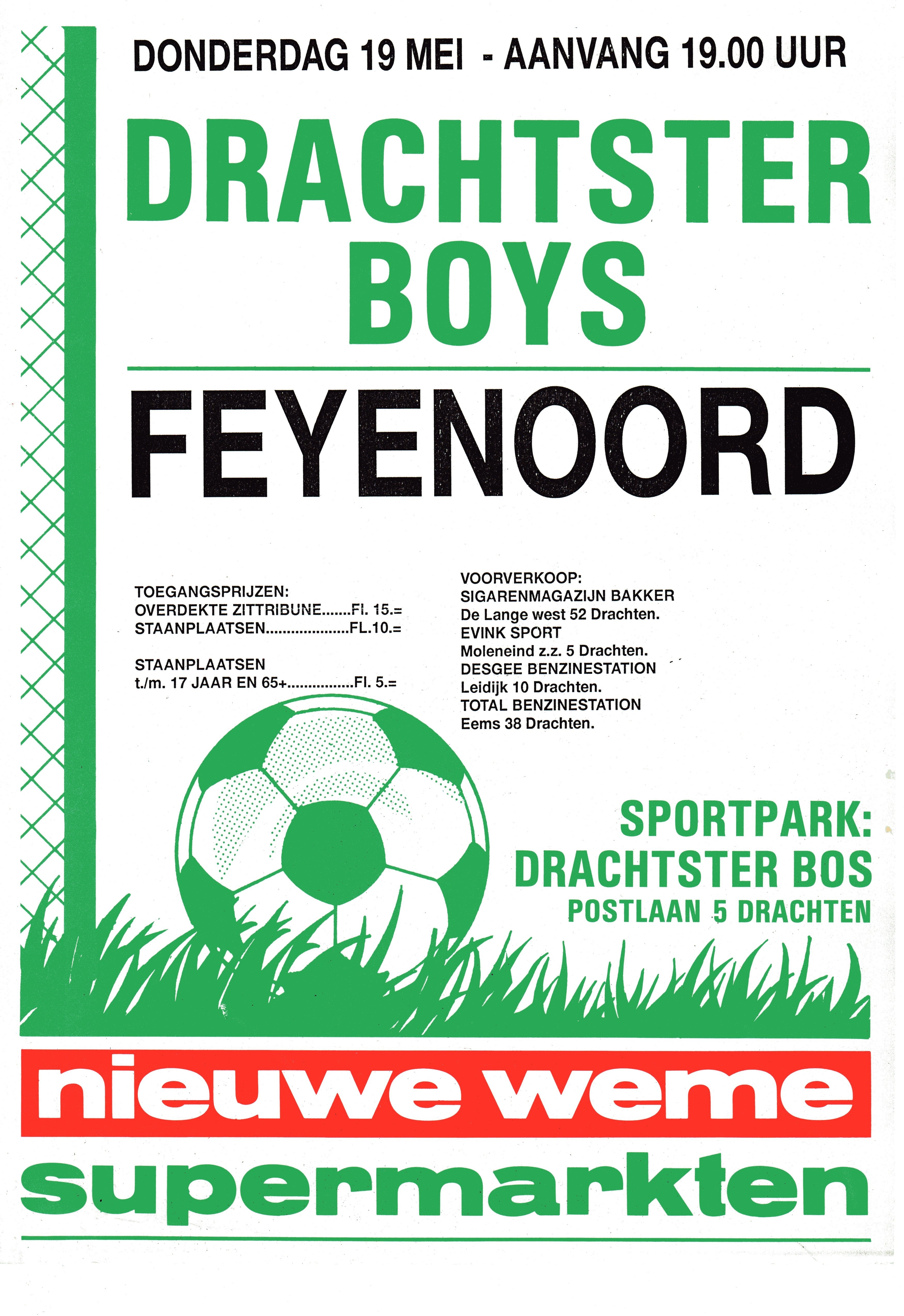 Op 19 mei 1994 speelt ‘grote broer’ Feyenoord een oefenwedstrijd tegen Drachtster Boys. In de Drachtster gelederen o.a. keeper Henk Jager, Marco Bolt en verzorger Goos Plantinga. Bij Feyenoord acteerden o.a. Regi Blinker, Arnold Scholte en John van Loen.