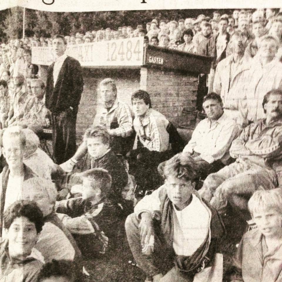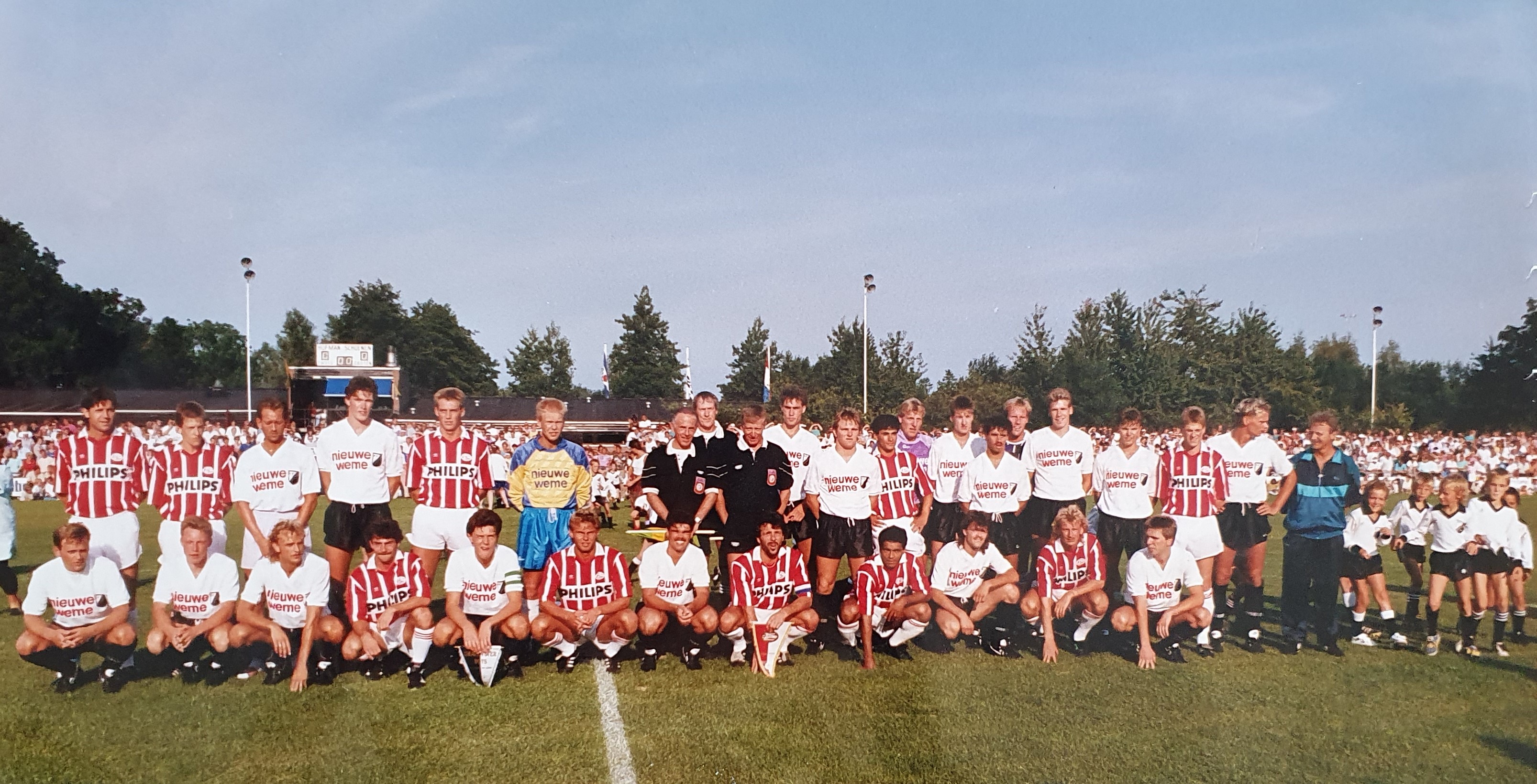 Alweer een topwedstrijd in het Drachtster Bos. Op 1 augustus 1990 doet landskampoen PSV het sportcomplex van Drachtster Boys aan tijdens zijn oefencampagne ter voorbereiding van het nieuwe voetbalseizoen. Op de foto o.a. de legendarische PSV’er Romario, met naast hem onze ‘eigen’ boy Jan Teitsma.