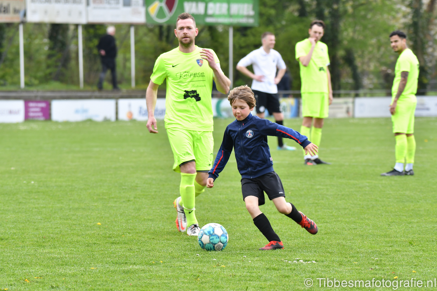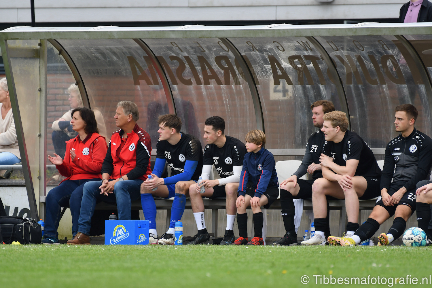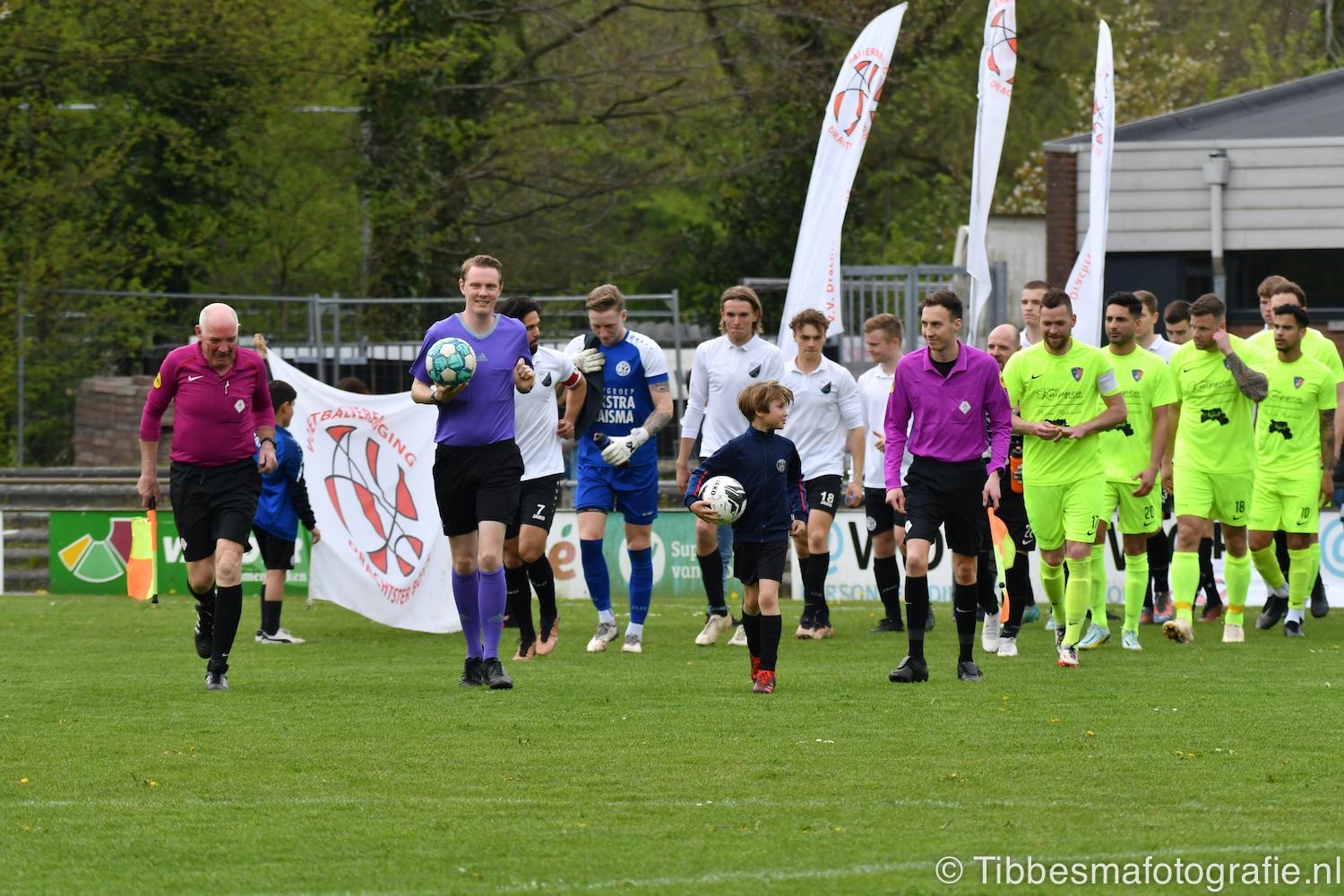 De jeugd die op de sfeeractie af is gekomen ratelt, toetert en trommelen er lustig op los tot dat moment. Ze maken de tribune een stukje feestelijker. Het weer is prachtig. Het zonnetje heeft genoeg kracht om door