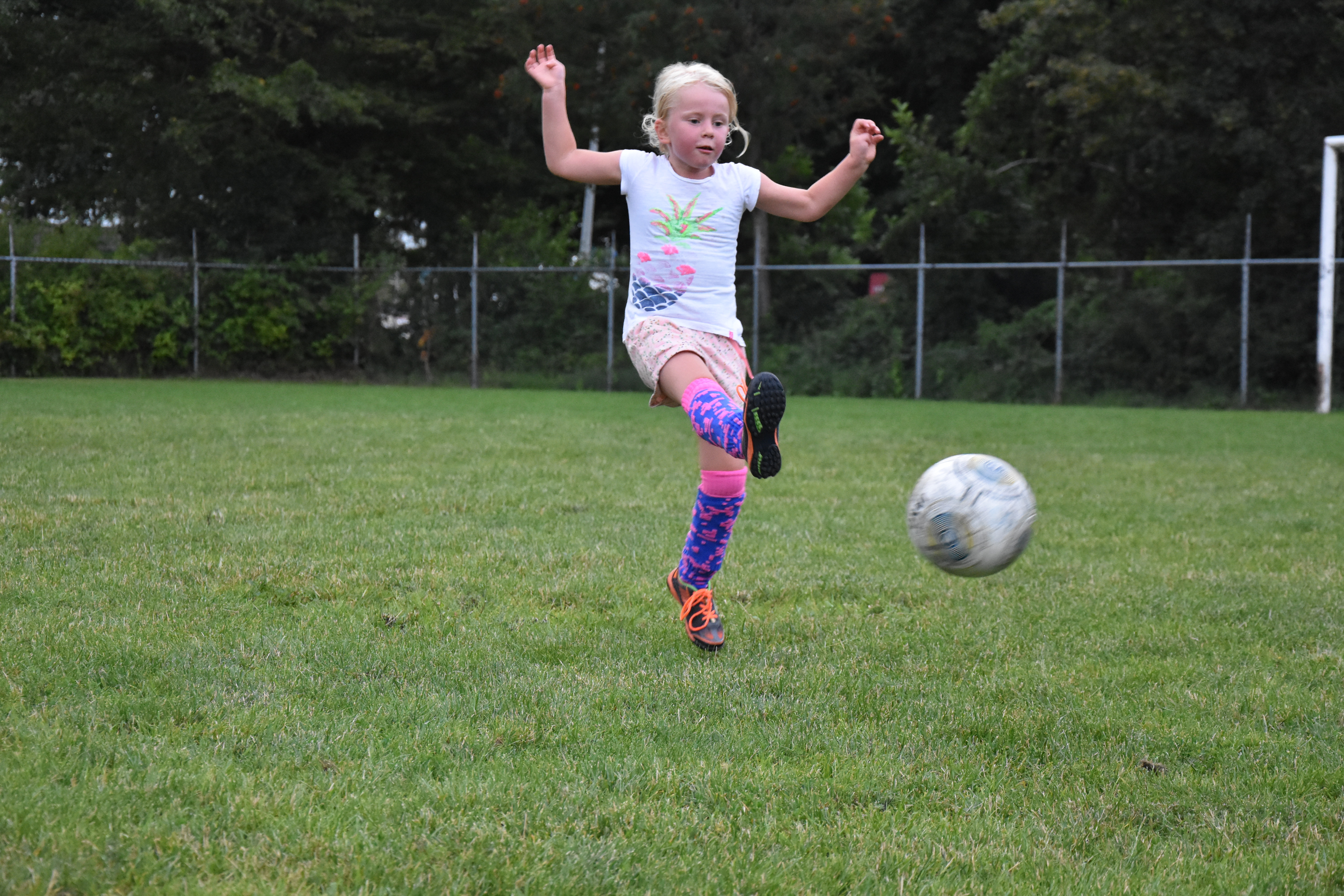 Om zeven uur blaast Jort, jonge held die elke avond aanwezig is, op zijn fluit om iedereen te verzamelen. Cor en ik kijken elkaar aan. Even hadden we gedacht dat het de tweede week wel eens rustiger kon zijn, zeker na de regen van vanmiddag. Maar niets is minder waar: dik zestig kinderen verzamelen zich op veld A. Gelukkig hebben we inmiddels ervaring. We moeten hier en daar een ‘knip’ zetten qua leeftijd. Alles onder 11 jaar, van 11-14 jaar, boven de 14 jaar. Het gaat steeds soepeler. Er zijn kinderen voor het eerst, die kijken nog erg de kat uit de boom. ‘Kijk, die-en-die is er ook’, hoor je dan een ouder zeggen. Tip: zeg dat niet tegen je kind. Hij of zij heeft dat allang gezien, vindt dat een beetje ongemakkelijk omdat de avond nog lang is en je je klas- of buurtgenootje heus nog wel tegenkomt. Voor kinderen die voor het eerst komen, kan het voetbal niet vroeg genoeg beginnen…
