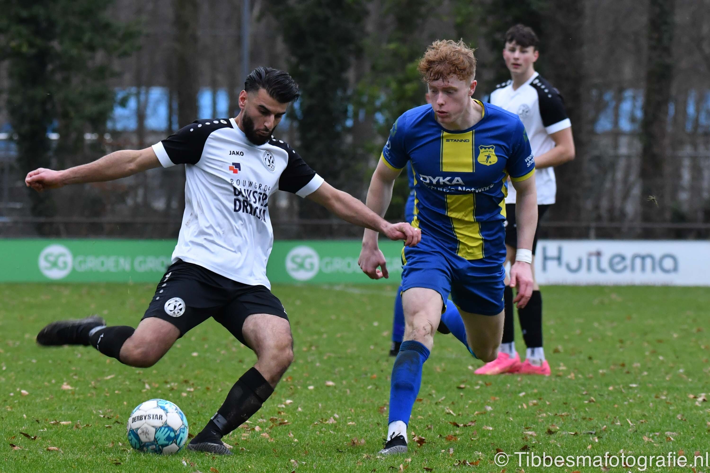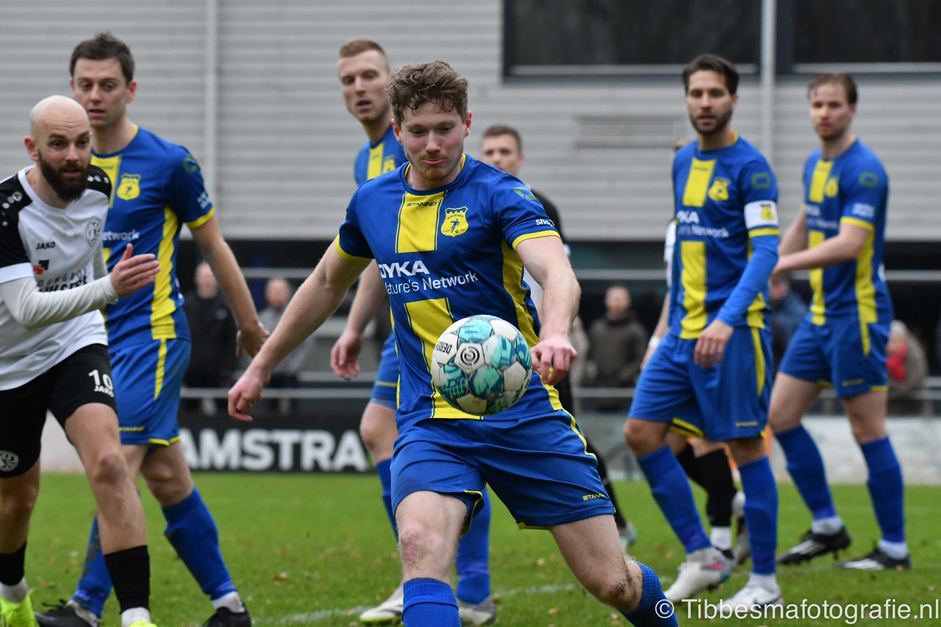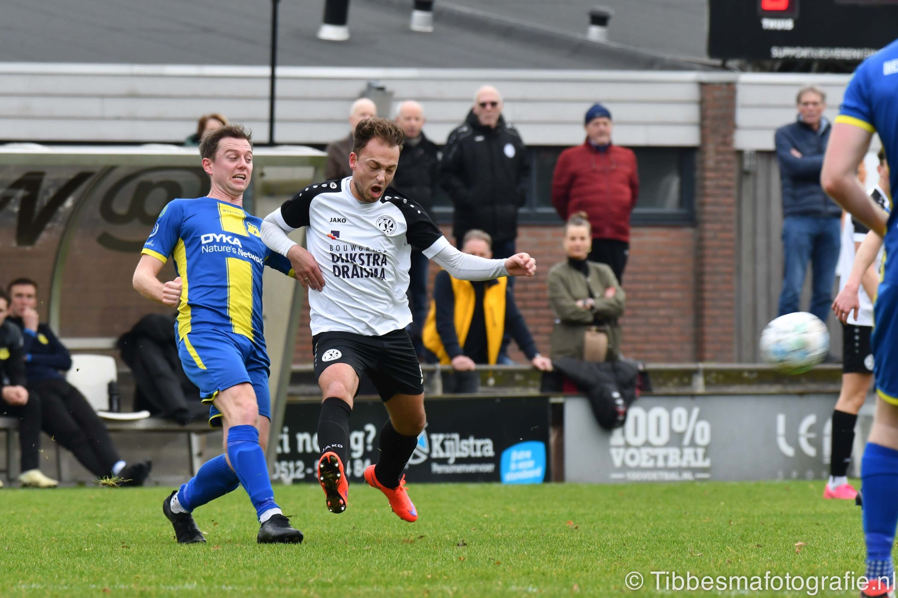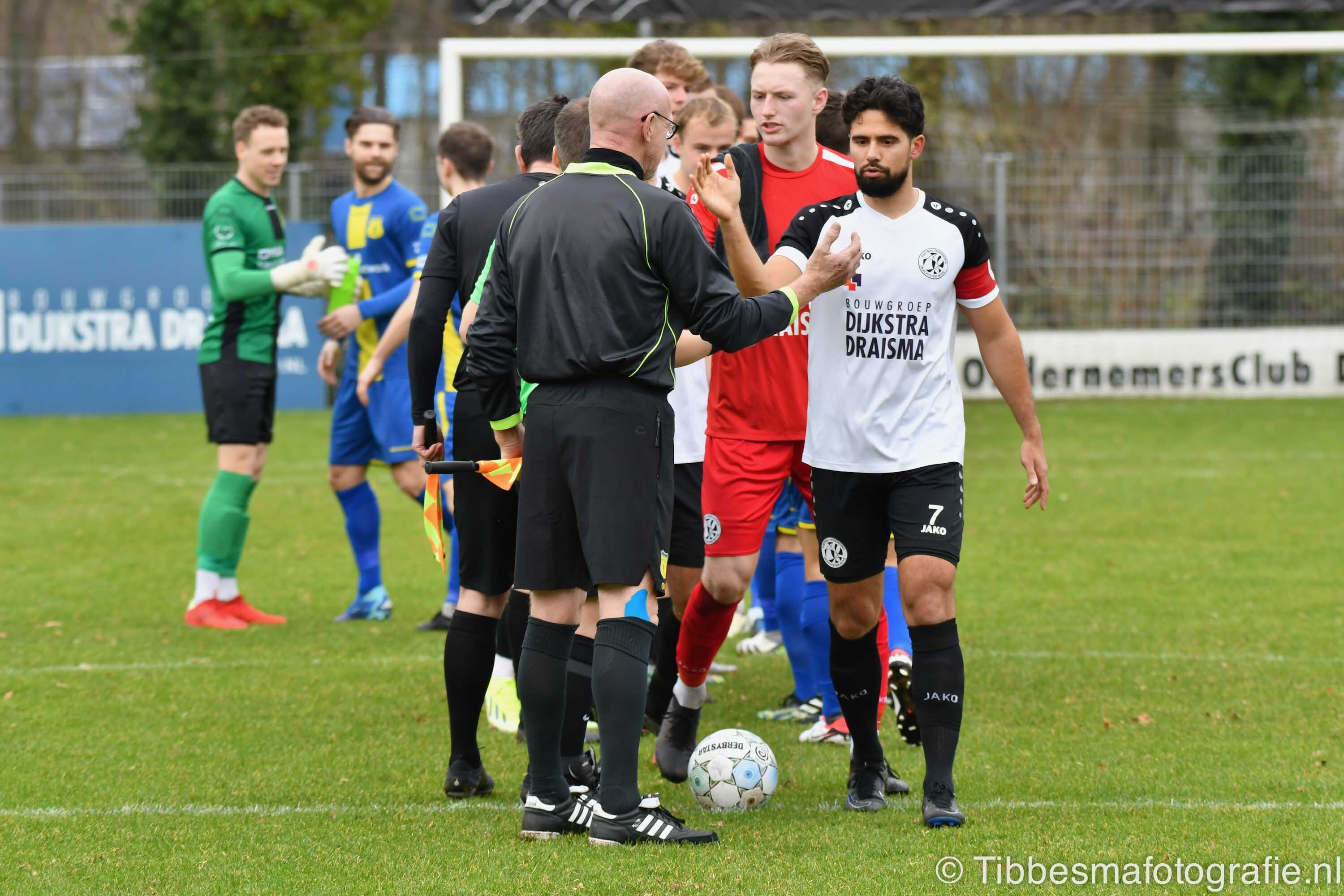 De eerste minuten zijn nog wat stroef. Er wordt gevaarlijk met het hoofd uitverdedigd. De kopbal van Erik schampt de paal van keeper Emile. Daarna gaat het echt los. Hartverwarmende lef en aanvalsdrift van de mannen uit Drachten. In de 22ste minuut de voorsprong. Joel schiet met militaire precisie vanaf circa twintig meter de bal in de bovenhoek. D’Olde Veste moet daarna alle zeilen bijzetten om nog meer schade te voorkomen.