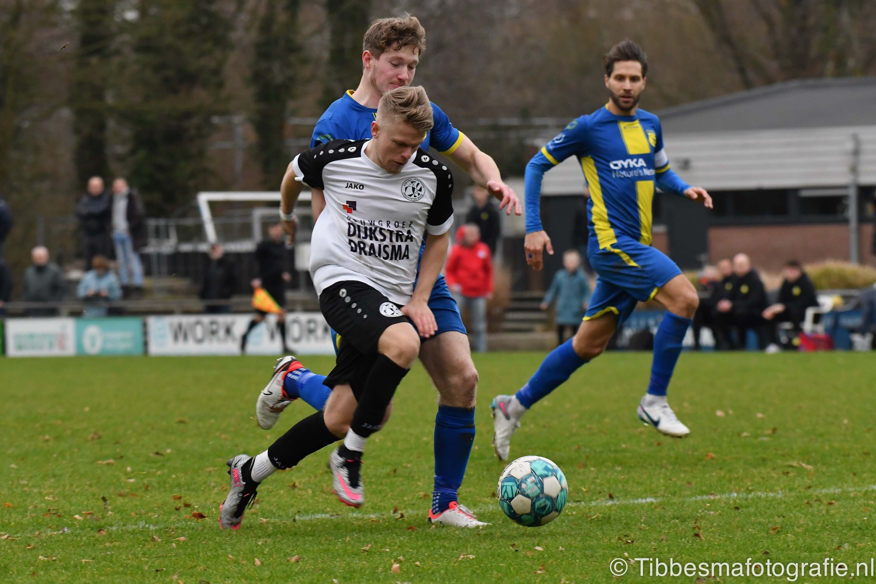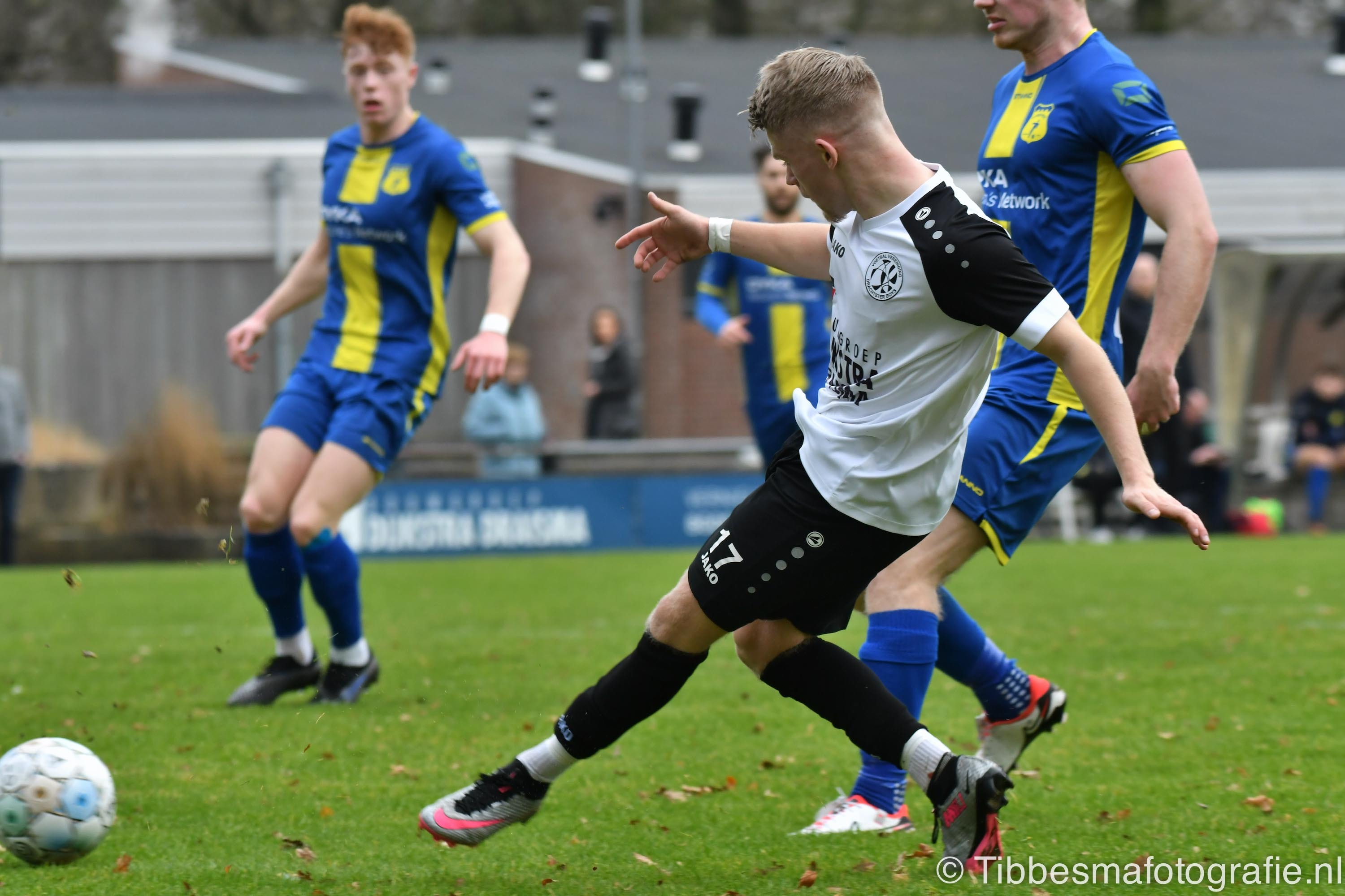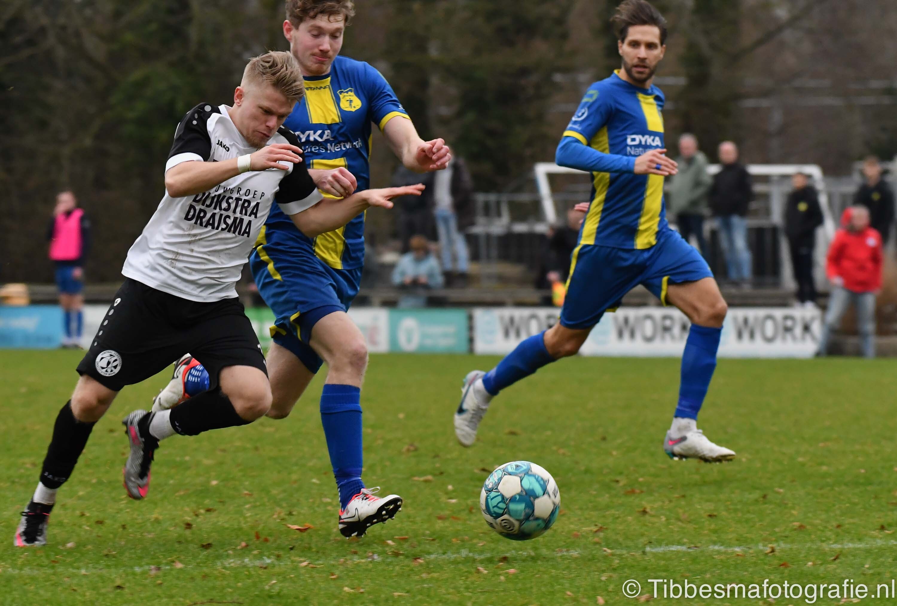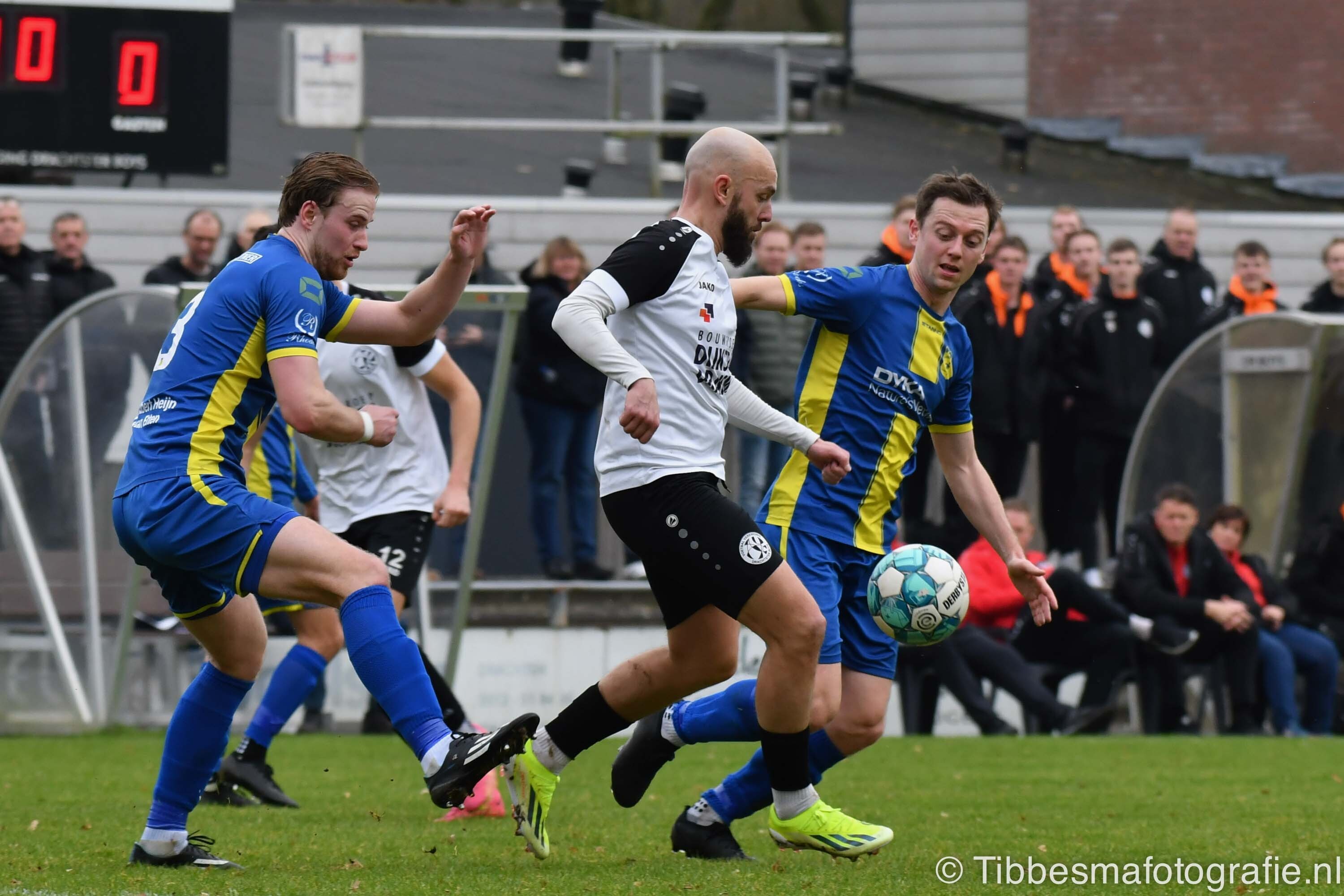 De eerste minuten zijn nog wat stroef. Er wordt gevaarlijk met het hoofd uitverdedigd. De kopbal van Erik schampt de paal van keeper Emile. Daarna gaat het echt los. Hartverwarmende lef en aanvalsdrift van de mannen uit Drachten. In de 22ste minuut de voorsprong. Joel schiet met militaire precisie vanaf circa twintig meter de bal in de bovenhoek. D’Olde Veste moet daarna alle zeilen bijzetten om nog meer schade te voorkomen.