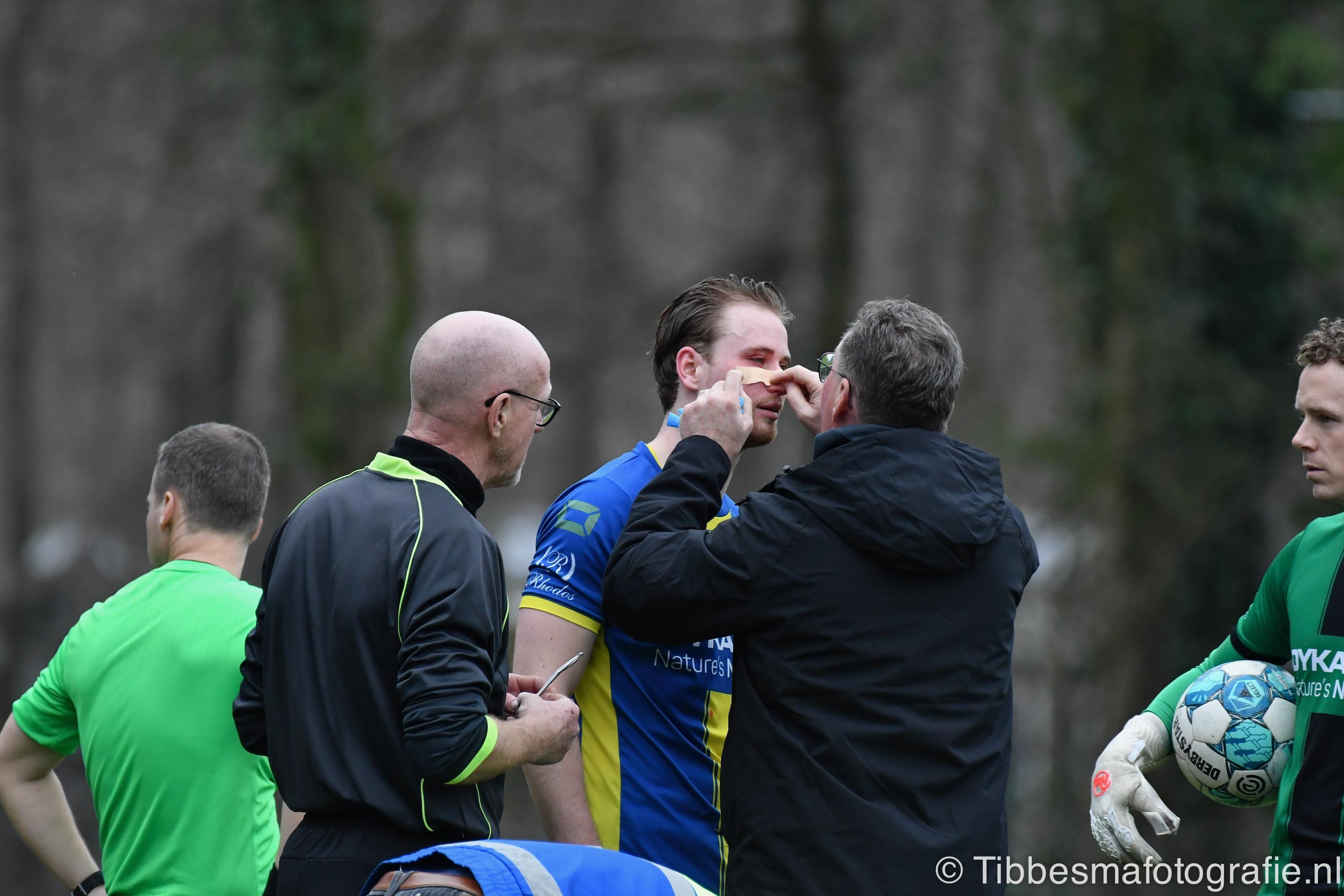 Het meeste bloed is afkomstig van Erik Barelds. Zijn neus wordt al dan niet opzettelijk getorpedeerd door de Olde Veste goalie. Het is een onoverzichtelijke scrimmage vlak voor het doel van Olde Veste. De behandeling neemt flink wat tijd in beslag. Erik moet het veld verlaten.